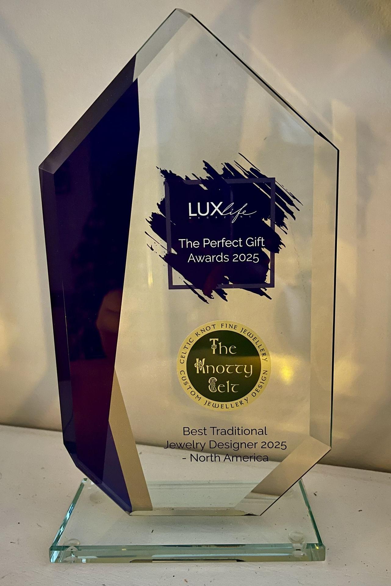 Nous sommes fiers d'annoncer que The Knotty Celt a été reconnu comme le Meilleur Designer de Bijoux Traditionnels 2024 – Amérique du Nord par les Perfect Gift Awards de LuxLife Magazine. Ce prix est un témoignage de l'artisanat et de l'attention aux détails qui entrent dans chaque pièce que nous créons.
